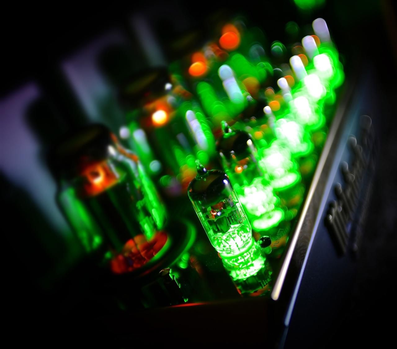 The seven small tubes are LED illuminated to indicate the amplifiers functional status: upon power up, they sequentially glow amber for a few seconds and then all turn green to signify system readiness. In the rare case of an output tube failure, the small tubes in front of it will turn red to notify you of the problem. Power Control is used to remotely control tube illumination from a McIntosh preamplifier.