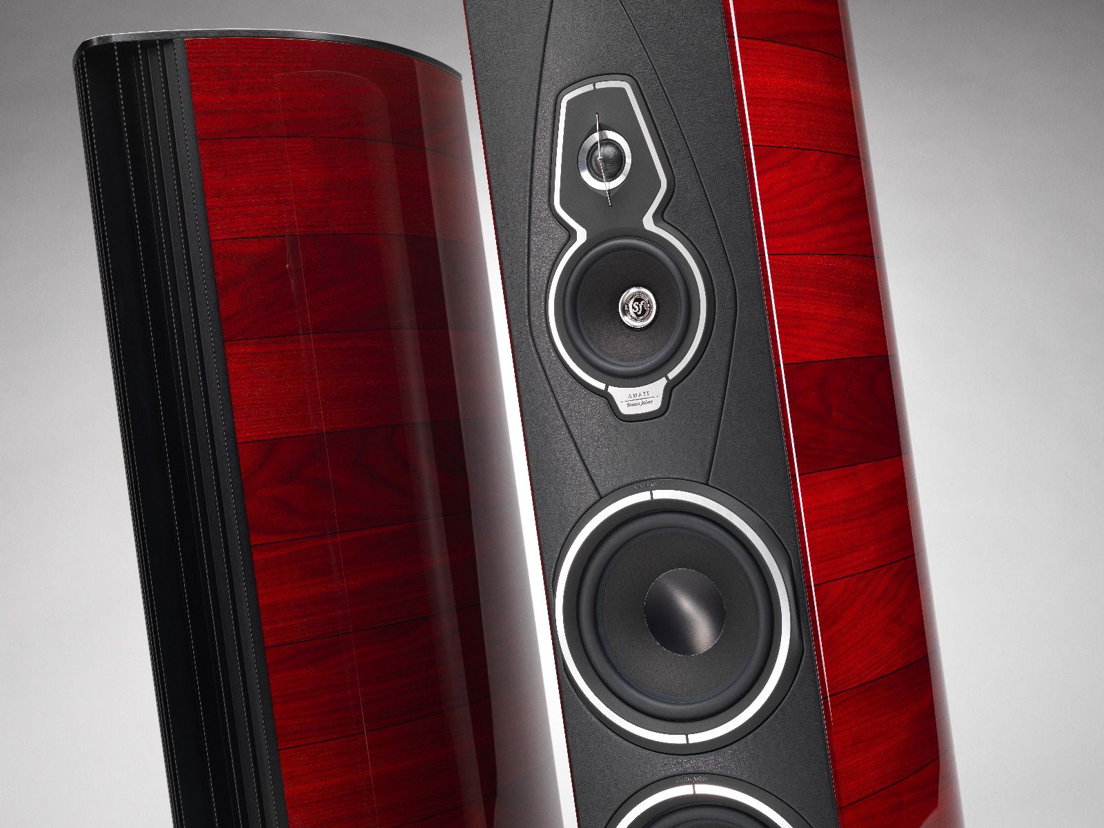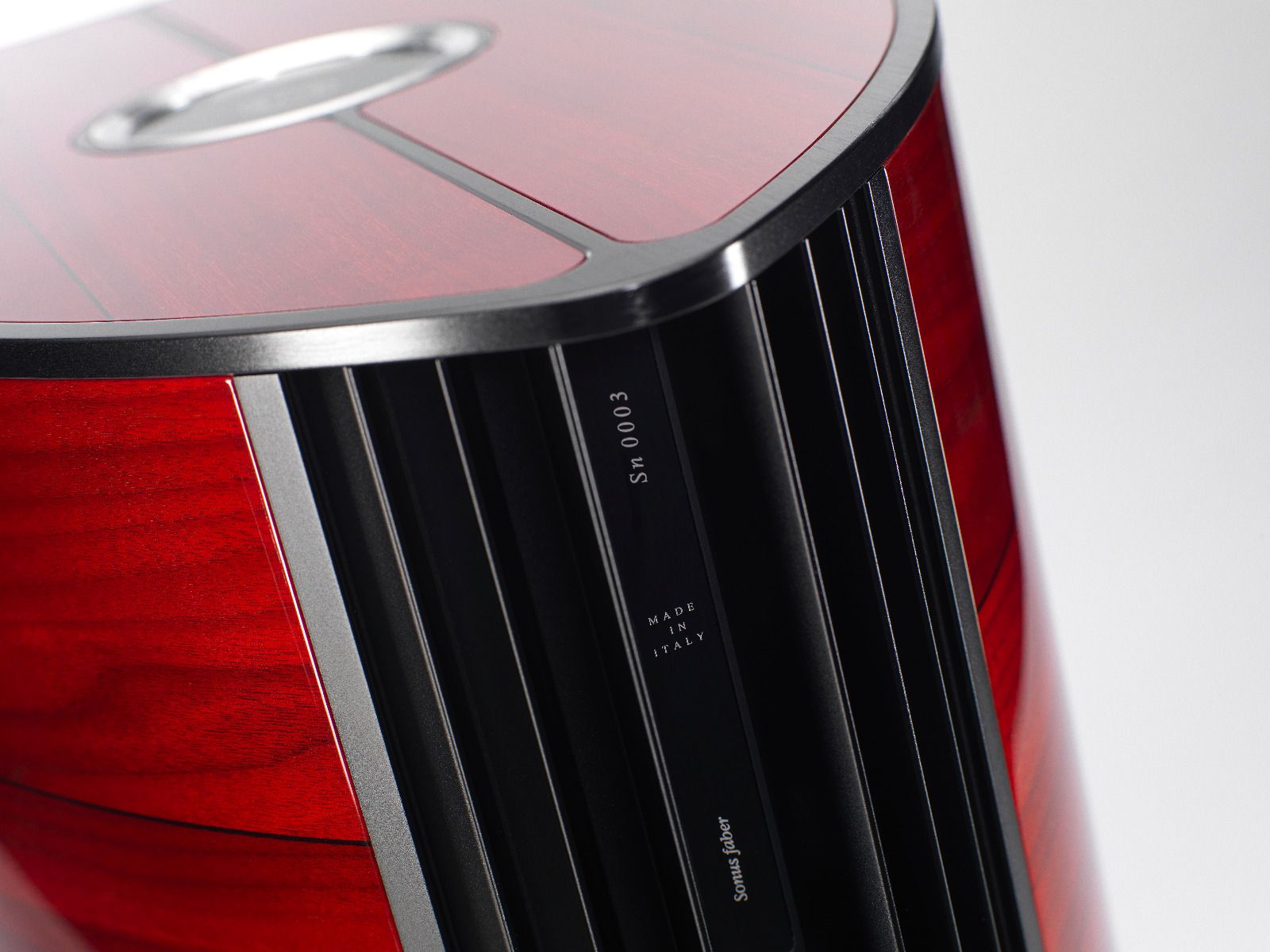 The violin shape of the speaker cabinet is the fruit of careful research and major restyling. The curves of the sides change and double, giving these speakers larger volumes especially on the back and making possible a better control of the internal resonances. The brushed aluminium enhances the line and the "Sf" logo in silk-screened glass placed right at the centre of the surface.